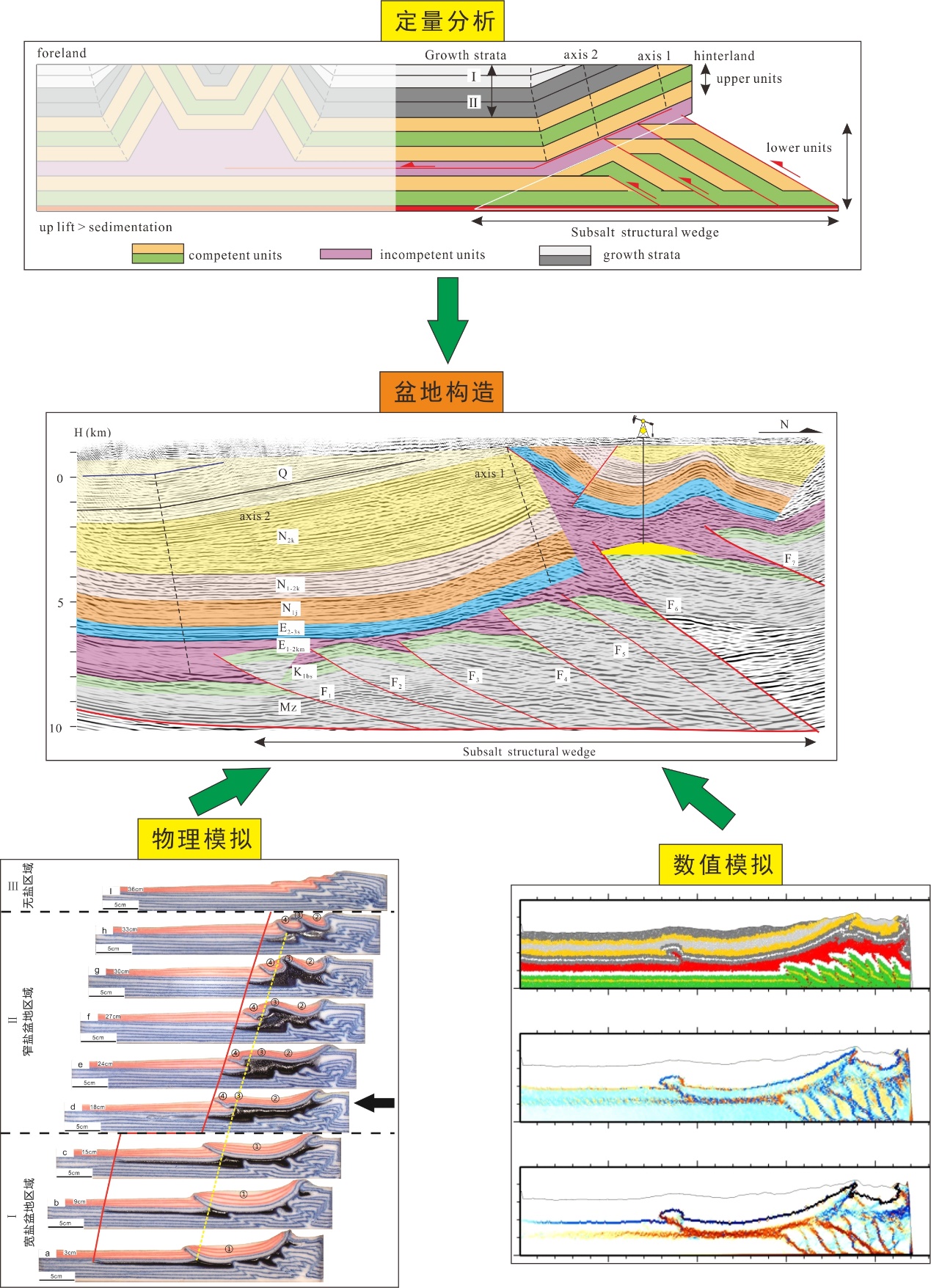盆地构造定量分析与成藏动力学:“沧海桑田”反映地表形态随时间的巨大变化,构造演化则是推动地表形态演化的内在因素。盆地作为地球表层的基本构造单元,它不仅是地质作用的产物,也是石油、天然气及其它矿产资源的赋存地和水资源的存储宝库。本方向研究是在构造解释及定量分析的基础上,结合构造物理模拟与数值模拟揭示盆地结构、构造演化过程、应力应变与动力学机制,建立盆地演化过程中油气和非金属矿产等成藏模式。