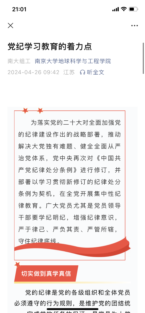 院党委及时发放了组织部为党员购买的《条例》,在学院微信公众号上转载刊发中央媒体、南大组工等有关解读文章,整理了地科院党纪学习教育材料汇编,营造学习氛围、做好学习保障。428日上午,地科院召开党委会,会议审核通过了《地科院党委关于开展党纪学习教育的实施方案》,接着举行理论学习中心组集体学习暨党纪学习教育读书班,通过领学、研学等方式,组织理论学习中心组成员在自学的基础上认真交流研讨。