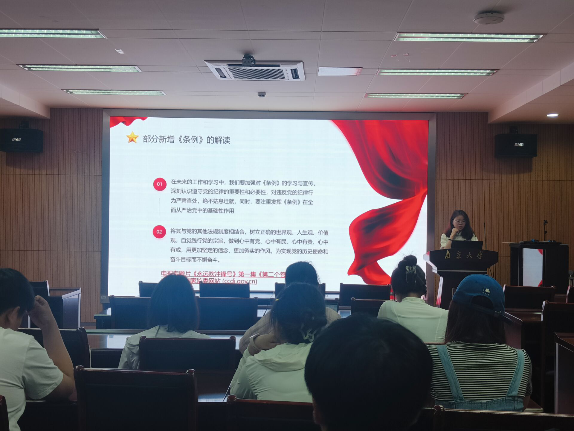 地球科学与工程学院2023级硕士生二支部于6月27日在朱共山楼125举办了以《中国共产党纪律处分条例》为主题的专题党课,通过深入解读条例内容,强化党员纪律意识,推动全面从严治党向纵深发展。党课由党支部书记陈婷婷同志主持。