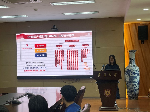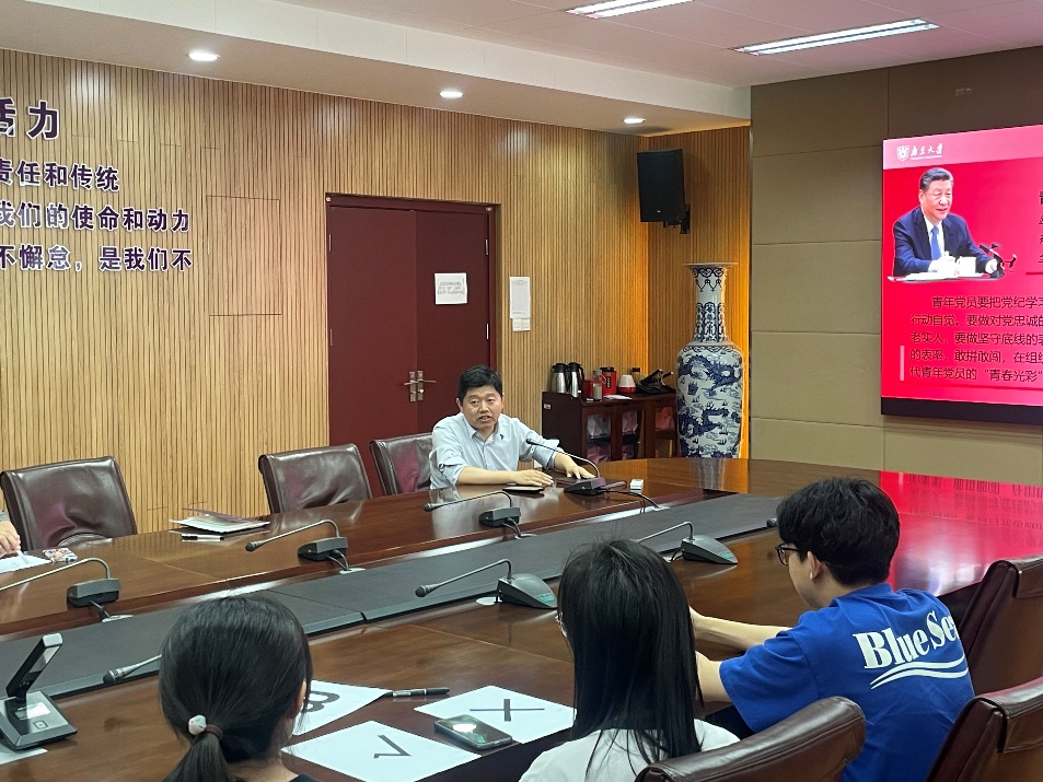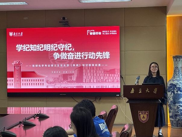 为深入学习贯彻习近平新时代中国特色社会主义思想和党的二十大精神,引导全体党员学纪、知纪、明纪、守纪,6月13日中午,地科院地化专业博士生党支部在朱共山楼a205会议室举行党纪学习教育主题党日活动,开展《中国共产党纪律处分条例》(以下简称《条例》)知识竞答比赛。会议由党支部书记严子妮同志主持,南京大学党委常委、副校长,学院联系支部党委委员陆现彩老师出席会议。