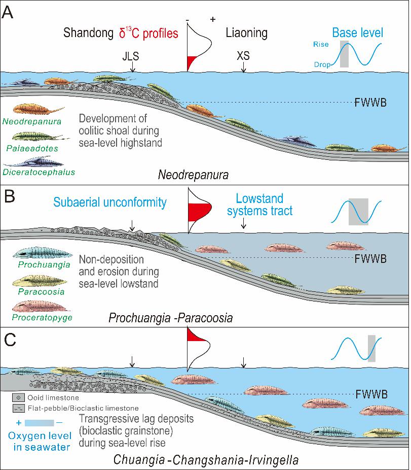 通过分析三叶虫动物化石多样性数据,发现spice事件之前三叶虫动物属种以区域性分布的徳氏虫类为主;但随着碳同位素正漂移和海水氧含量下降,化石属种多样性并未发生明显变化,但三叶虫动物属种成分发生重大更替,徳氏虫类完全被斜坡栖息的三叶虫类(例如fenguanella、proceratopyge、prochuaia和paracoosia)所取代。该现象与在北美大陆发现的同期marjumian末灭绝事件中三叶虫的演替模式相一致,即浅水栖息的三叶虫动物群被更加缺氧耐受的深水三叶虫动物群所替代,表明这种三叶虫动物演替是一种全球性现象。