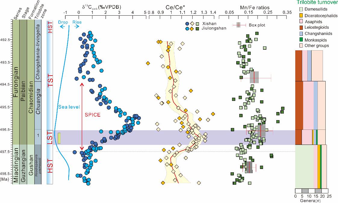 然而,spice事件期间海水缺氧和生物灭绝之间的直接因果联系一直缺乏定量化石多样性证据的支持,尤其缺乏来自同一沉积盆地内高分辨率化石多样性数据和区域性氧化还原方面的证据。因此,精细刻画spice事件在不同区域发生过程,对揭示其与同期三叶虫动物灭绝事件之间因果关系及其全球普遍性规律有重要意义。