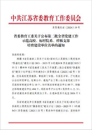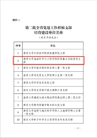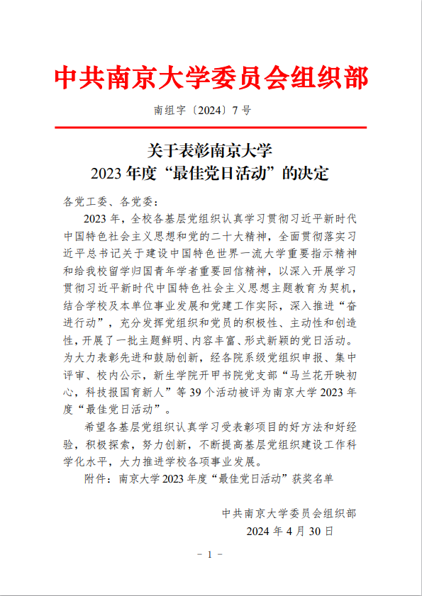 近日,省委教育工委公布了第二批全省党建工作示范高校、标杆院系、样板支部培育建设单位,我院国家重点实验室党支部成功入选第二批“全省党建工作样板支部”培育建设单位。此外,在2024年度南京大学“两优一先”评选中,被评为“南京大学先进基层党组织”荣誉称号。