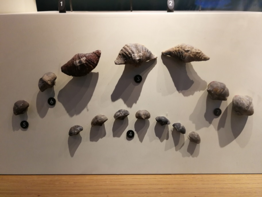 在b1层“演化之道”展区的“从水到陆”部分可以看到许多不同的石燕化石。这是距今4.5亿年前奥陶纪晚期出现的是一种古无脊椎腕足动物。其外贝体为横方形,向左右延伸时,逐渐收缩上翘开张,壳面具粗强的放射状褶线,状如燕翼,所以古人就将它称作“石燕”。