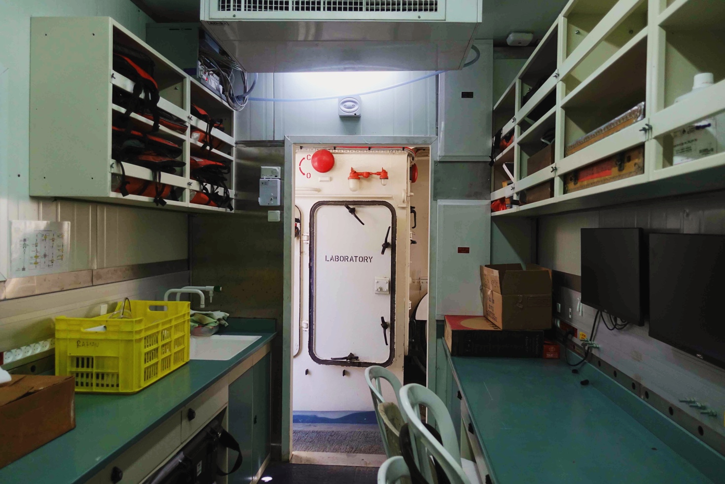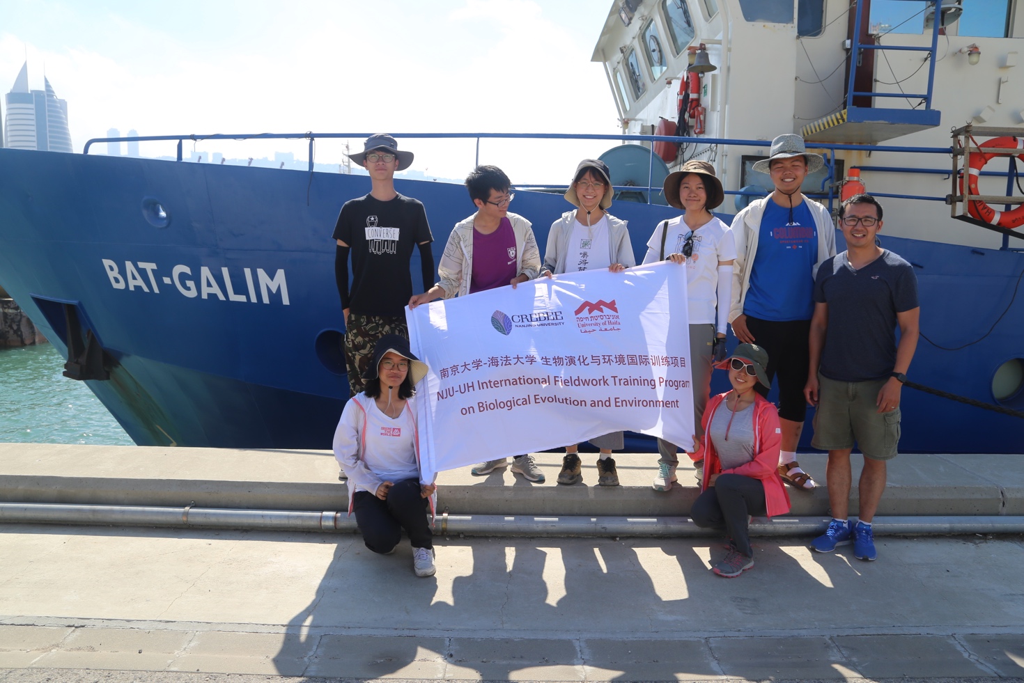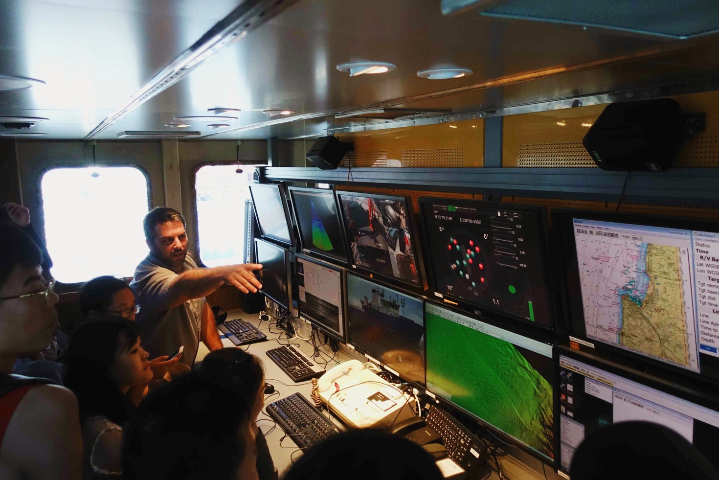 午饭后,我们来到海法港,登上了海洋学院的科考船,参观船上的实验室、生活区、船尾的仪器平台、驾驶室和驾驶舱后部的监控平台。技术人员为我们讲解了如何测绘海底地形和沉积物地层情况、在船上进行的化学检测实验、仪器设备的布设、船只的服役情况和船员的日常生活情况,让同学们对海洋科学研究的具体过程有了直观的体验。