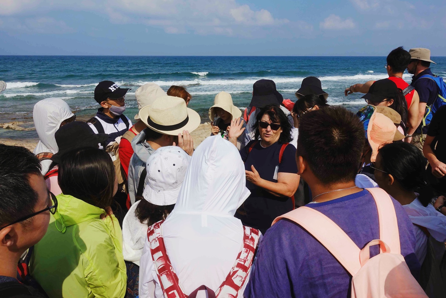 8月9日是课程的第二个出野日。我们来到了建于地中海边的海法大学海洋学院,海洋学院设有海洋文明、海洋生物、海洋地学、海洋技术四个部门。我们先在海滩上了解这一带海岸重要的考古发现,在老师的指引下,我们在地面的碎石中发现了许多陶片,老师就着我们捡起来的碎片演示它们可能在什么样的器物上作为什么部件,老师从其纹路和形状上判定大部分碎片可以归属到罗马和拜占庭时期。