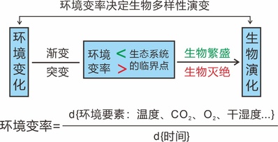 文章通过对5亿多年以来地球发生的各种重大生物与气候事件的环境背景、过程及其原因进行了深入地分析,其结果表明地球在过去5亿多年中大部分时间处于两极无冰的温室效应阶段,长时间稳定大冰期往往导致生物辐射,长期稳定的温室效应期并不导致生物大灭绝。中生代极度繁盛的恐龙时代其海水表面平均温度就比当今地球可能高了10℃以上,导致地球生态系统发生灾变的最根本驱动因素是地球环境因子(包括温度、co2、海洋酸碱度、降雨量等)变化的速率,而不是简单的环境背景值高或低,当环境因子变化速度超出生态系统的承受力时,生态系统来不及适应环境而崩溃,从而发生生物大灭绝;当环境因子变化速度较慢时,生态系统有足够的时间来适应环境变化而得以繁盛(图2)。