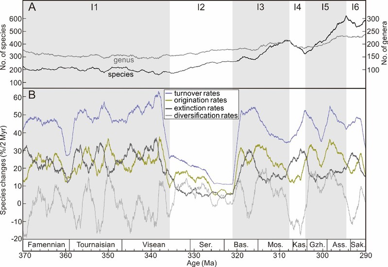 然而,我们的最新研究结果对此提出了质疑。我们汇集了中国境内551条上泥盆统至下二叠统海相地层剖面中的化石记录,使用约束最优化方法进行计算,获得了晚泥盆世-早二叠世海洋生物物种多样性曲线。结果表明,自石炭纪维宪期中期(336ma)至二叠纪阿瑟尔晚期(295ma),海洋生物属级与种级多样性均显著上升,命名为石炭纪-二叠纪最早期海洋生物多样化事件(carboniferous-earliest permian marine biodiversification event, cpbe)。由于研究剖面在晚古生代的主要板块均有分布,所以这次事件具有全球代表意义。