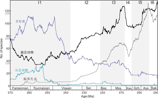 cpbe事件时期(i2-i5),䗴有孔虫、腕足动物物种多样性增加,而自由游泳的牙形类和头足动物则逐步下降