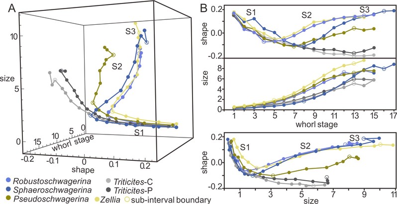 早二叠世䗴有孔虫的辐射是晚古生代冰期中生物多样性变化的一次重要事件,对海洋生物多样性变化有关键作用。其中,具有球状外形的假希瓦格䗴亚科的出现和辐射,代表了一类形态特异类群的出现。它们如何演化而来?代表了怎样的䗴有孔虫演化趋势?我中心史宇坤副教授通过一种完全定量化的形态测量学方法,研究了早二叠世假希瓦格䗴亚科最具代表性的分子,假希瓦格䗴、壮希瓦格䗴、球希瓦格䗴和车尔䗴四个属在个体发育过程中的形态变化,发现它们的祖先类群麦粒䗴,经历了加速(acceleration,形态发育速率加快)、超期发生(hypermorphosis,发育时段超期)、前移(predisplacement,发育时间提前)三种过型发生(peramorphic)过程,演化而成了具球形壳体的假希瓦格䗴亚科类群。研究提出,生物个体发育和系统发生中常见的异时发育,可能多数都复合了两种及以上的异时发育类型,是个复杂过程。这一过程的研究可以通过形态测量学方法进行量化,是生物个体发育和系统发生关系研究的良好参照。该项研究成果《heterochronic origin of spherical fusulinid foraminifera in the late paleozoic》于11月26日在古生物学著名期刊《paleobiology》上线。