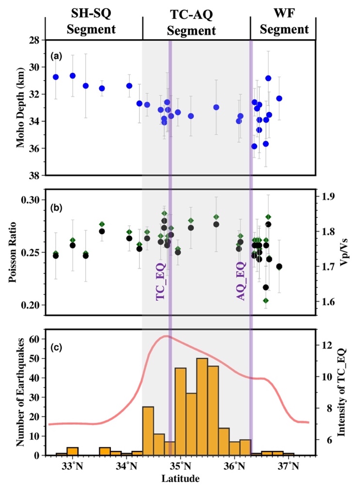 图1 郯庐断裂带中南段地壳结构与地震活动性对比。(a)莫霍深度;(b)泊松比和vp/vs比;(c)地震活动性,橙色柱状图表示地震次数,红线表示郯城地震烈度分布。紫线标出了郯城地震和安丘地震的位置。