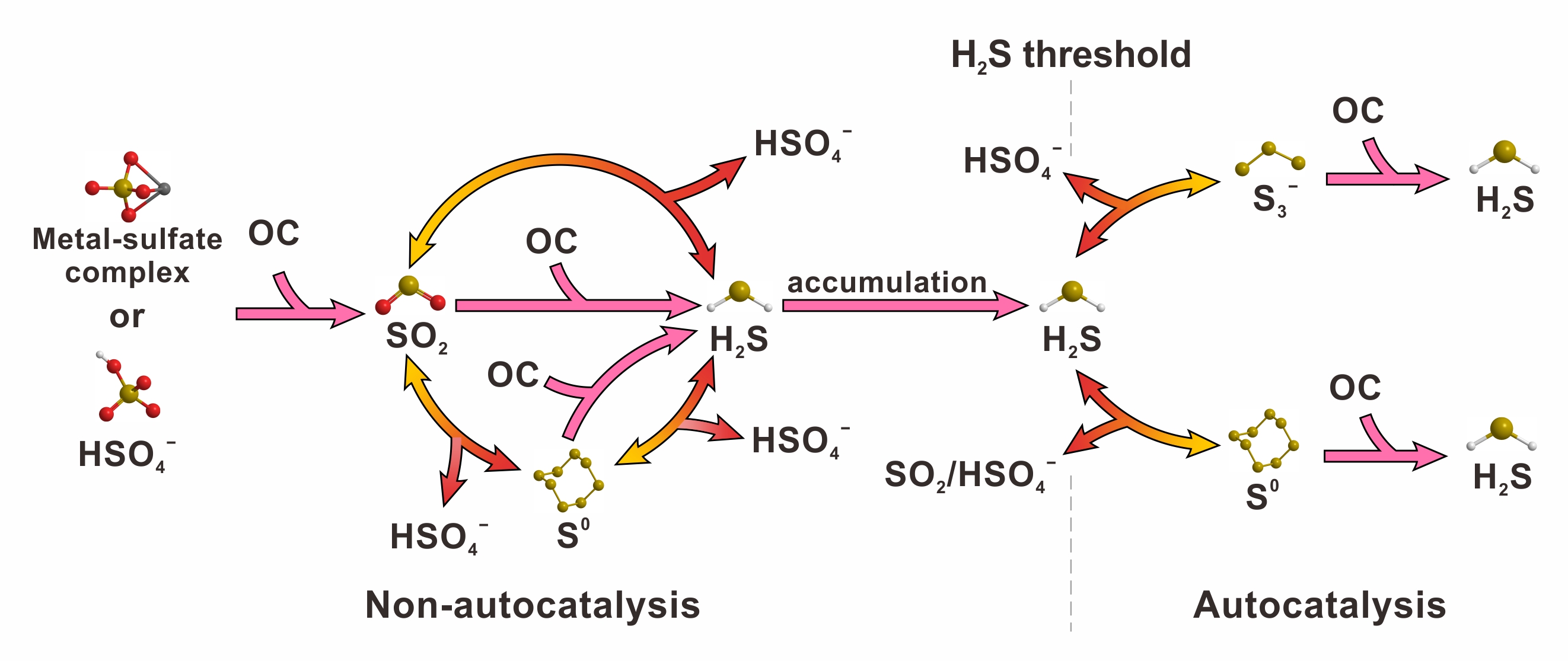 fig. 2 the transformation of sulfur species during tsr reaction. oc denotes organic compound. double-headed arrow represents a reversible reaction.