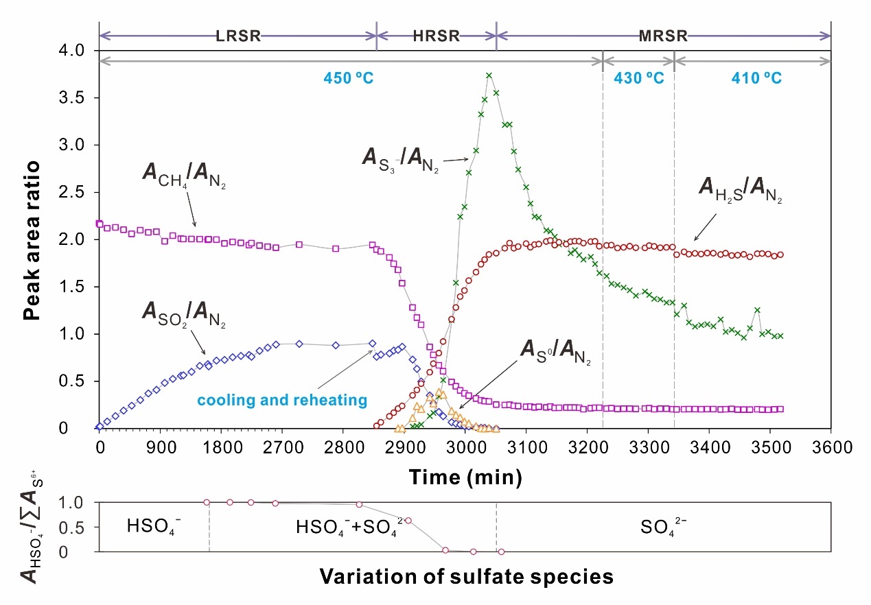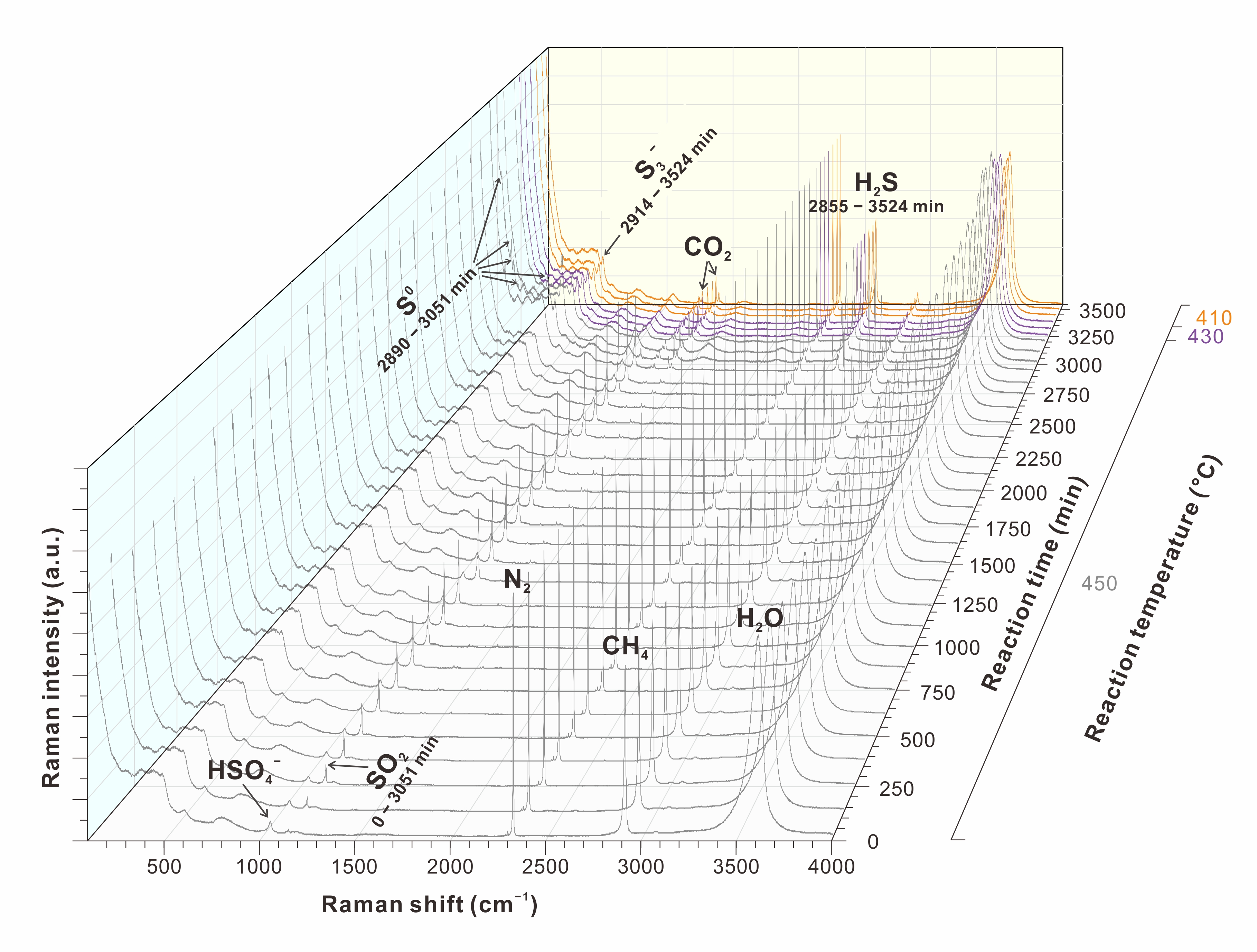 thermochemical sulfate reduction (tsr) is a common organic-inorganic interaction in sedimentary basins. tsr is in close association with hydrocarbon evolution and metal sulfide precipitation in the mississippi valley-type deposits. currently, the reaction pathway and mechanism of tsr remain controversial, hindering our understanding of metal sulfide precipitation and hydrocarbon evolution. sulfur species involved in tsr reaction are highly complex, with some intermediate sulfur species being stable only at elevated temperatures (e.g., s3-, stable at >150℃). additionally, sulfur species can react with the metallic chamber at elevated t-p conditions, making traditional autoclave quenching method ineffective for investigating sulfur transformation pathway during tsr. in contrast, fused silica capillary capsules (fsccs) serve as ideal micro-reactors for simulating tsr experiments because they are inert to sulfur species and allow online optical and spectroscopic observations. utilizing fsccs and in situ raman spectroscopic observation techniques, professor xiaolin wang's group successfully characterized sulfur transformation pathway and conducted systematic quantification analyses and simulations. these works aim to reveal the mechanism and kinetics of the tsr reaction.