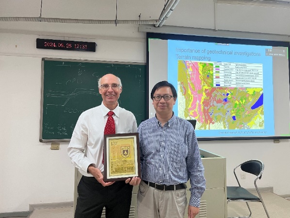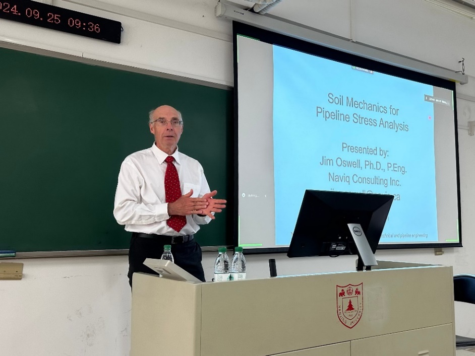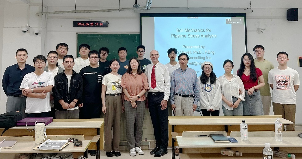 此次访问期间,oswell教授在仙林校区逸夫楼b-310室讲授了一场精彩的国际短期课程,主题为“soil mechanics for stress analysis and pipeline design”。该课程围绕土力学与地质灾害的基本原理,深入阐释了这些原理在管道设计与应力分析中的实际应用,旨在搭建地质力学、岩土工程与管道工程之间的桥梁,促进不同学科领域间的学术交流与合作。本课程采用线上线下相结合的教学模式,国内外100余位学员参与学习。在课堂上,oswell教授深入浅出的讲解、诙谐幽默的语言、精彩的授课内容,博得现场师生阵阵掌声。课程结束后,朱鸿鹄教授代表地科院师生向oswell教授致以谢意,并赠送了南京大学纪念品。