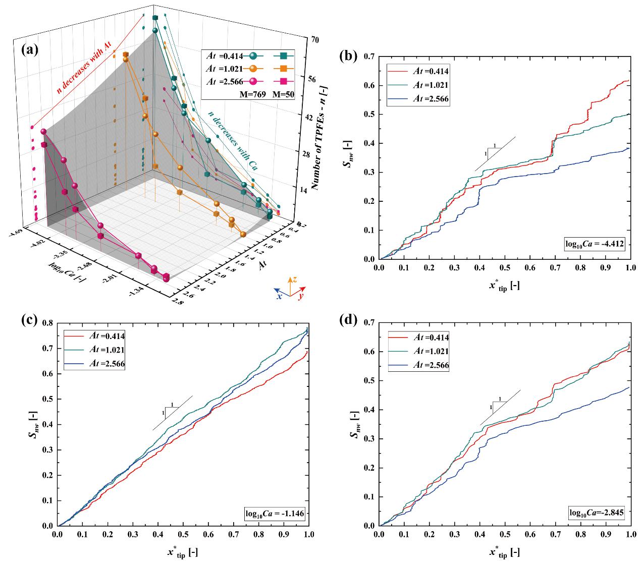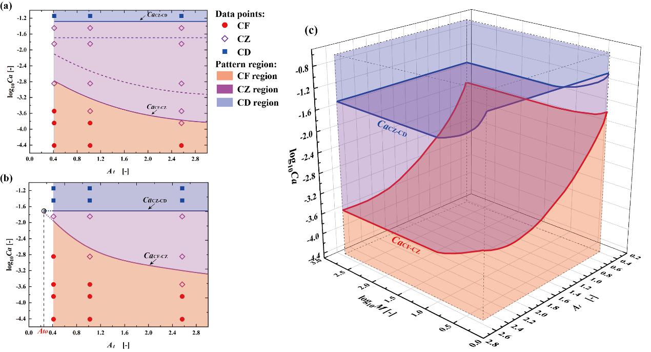 图3. 裂隙开度场各向异性对临界毛管数(cacf-cz和 cacz-cd)的影响以及考虑裂隙开度场各向异性(at)、粘度比(m)和流速(ca)的三维驱替模式相图