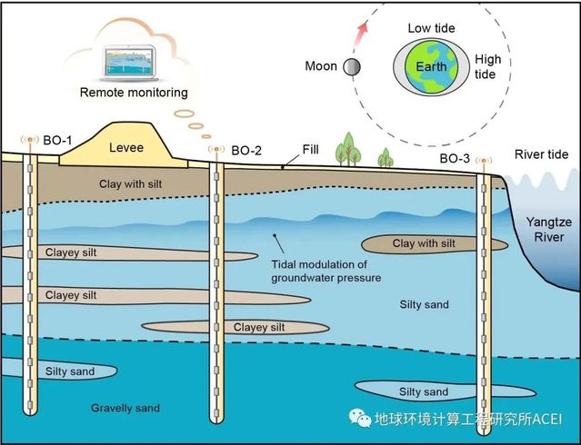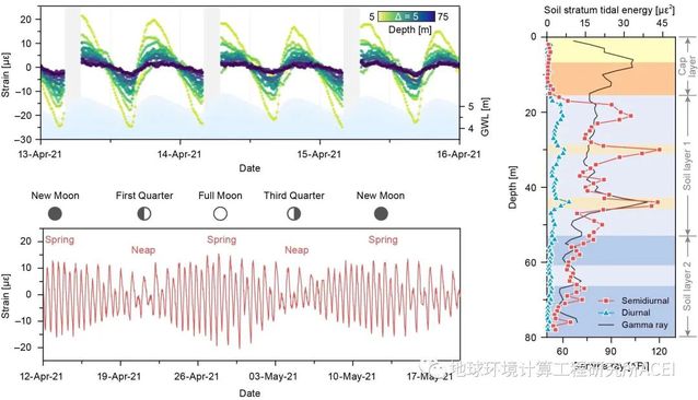 为破解这一谜题,我院施斌教授带领团队研发出了具有微应变精度的超弱光纤光栅地层形变感知系统,并将该系统安装在长江河口区指南村三个70米的钻孔中(图2),首次观测到了地层形变的半日潮(semidiurnal)和大-小潮(spring–neap cycle)现象,并与张诚成博士和荷兰瓦格宁根大学a. j. f. hoitink教授通力合作,提出了土层潮汐(soil stratum tide)新概念,将其定义为河流潮汐影响范围内由于孔隙水压力波动而引起的土层周期性形变的现象,并揭示了土层潮汐与岩性和深度的依赖关系(图3)。