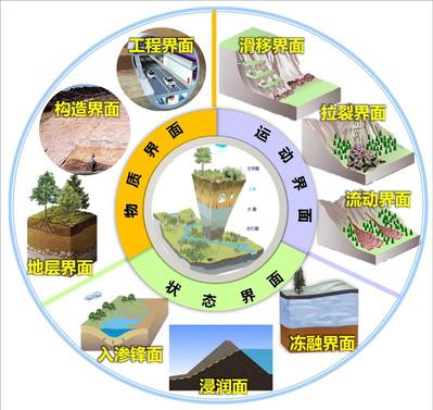 长期的工程地质实践表明,岩土体的灾变与岩土体内部存在的各种力学不连续界面的分布与演化密切相关。作者根据不连续界面的变化特点,将岩土体中的界面归纳为三类,即物质界面,状态界面和运动界面(图1)。物质界面是岩土体灾变的基础,状态界面是岩土体灾变的诱因,运动界面是岩土体灾变的后果。三类界面是岩土体灾变的锁钥,它们的共同的特征是高隐蔽性和强不确定性。因此,提高岩土体原位观测技术水平是灾害风险评价与预测预警的关键。
