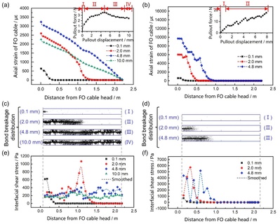 图2 不同阶段光缆应变分布、粒间断裂和界面剪应力分布