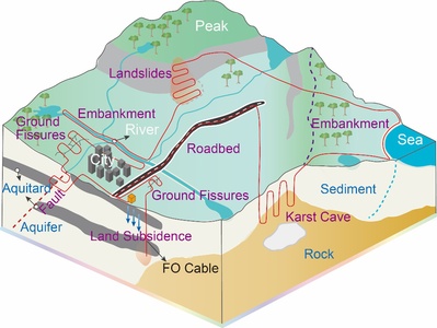 近年来,光纤感测技术已被广泛应用于土体的变形监测(图1)。然而,土体作为松散堆积体,其物理力学性质与质地相对均一的感测光缆存在显著差异,且土体的变形行为十分复杂,这使得感测光缆-土体的变形协调性成为决定感测光缆能否准确获得土体变形的关键因素。受到测试设备的限制,利用实验手段揭示感测光缆与松散土体的变形耦合行为仍因无法准确观察到光缆与土体的相互作用而存在一定限制。为此,顾凯副教授课题组基于高性能离散元数值模拟软件matdem建立了一个已知最精细的二维模型(活动颗粒超2×105个),重现了不同围压条件下光缆在土中的拉拔过程,深入揭示了光缆-土体变形协调行为。