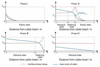 研究结果表明:离散元方法能够很好地揭示拉拔过程中光缆与土体颗粒各自的变形特征以及在实验中无法获得的光缆-土体界面剪应力分布(图2);地层围压是决定光缆-土体耦合的关键因素;不同于常用的“应变传递深度lε“,光缆与土体界面的”滑脱深度ls“能够更准确的反映光缆与土体间的耦合程度;阐明了应变软化型光缆拉拔过程中各阶段光缆轴应变分布与界面剪切应力分布的理论模型(图3),并提出了分别基于“光缆轴应变”和“界面剪应力”的光缆-土体变形协调性评价方法。这些结果能够为深入理解光缆-土体变形协调性提供重要依据,为土体变形光纤监测提供科学支撑。