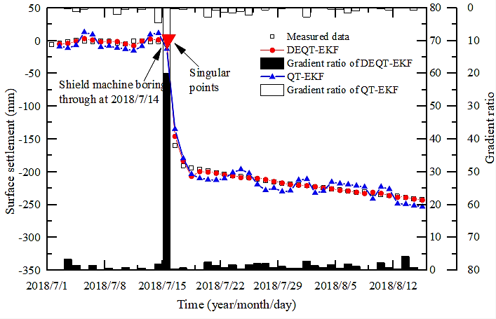 基于此认识,我院张巍副教授与朱鸿鹄教授共同合作,构建了一种用于复合地层盾构掘进场景下预测预警城市地面塌陷的新型智能计算框架,该框架采用群智优化扩展卡尔曼滤波对盾构掘进控制参数多元融合后,实时预测未来时刻地表位移量;随后采用梯度比准则辨识未来时刻地表位移是否已进入临界态阶段,如是,则该时刻为奇点时刻即触发预警。基于现场实时监测数据,采用上述框架成功实现了盾构穿越典型土-岩复合地层掘进诱发地面塌陷的灾前预测预警。该框架将有助于降低物质界面不确定性所导致的地质灾害风险,为我国韧性城市建设发展提供支撑。